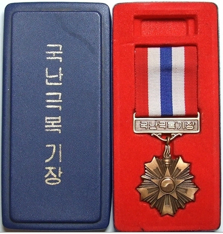 저 물건은 '국난극복기장' 이란 물건이다.일종의 훈장이다. 전두환은 12.12반란을 일으키고 정권을 완전히 장악한 다음에 1980년 전후를 '국난 기간'으로 규정, 이 시기에 복무한 군인,군무원,공무원, 그리고 주한 외국군인들에게 저 기장을 수여했다.말하자면 '5,18 광주민주화 운동'을 진압한 것에 대한 공로의 댓가였다.