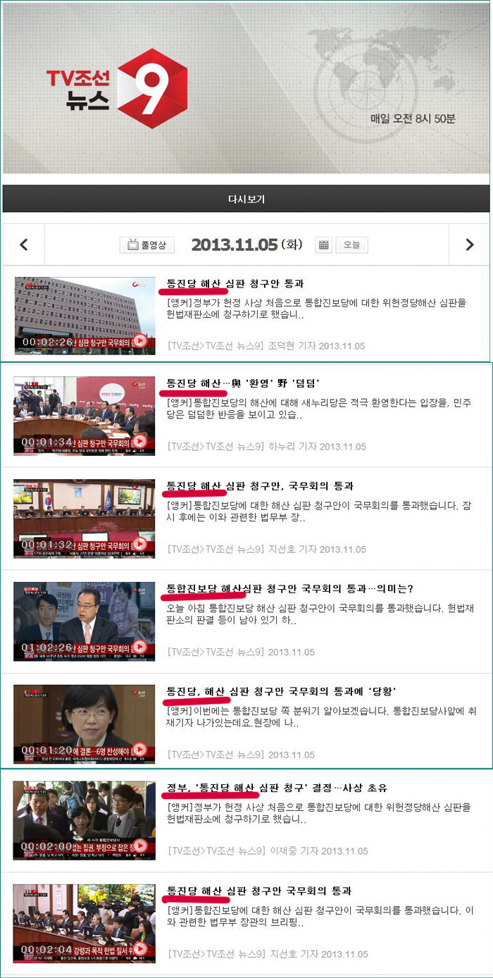 <손석희 JTBC 뉴스 9>의 편성은 골고루 여러 사안에 대해 방송을 했음을 알 수가 있다. 통합진보당에 관한 뉴스는 단 3개. 그런 반면에 <TV조선 뉴스 9시>는......