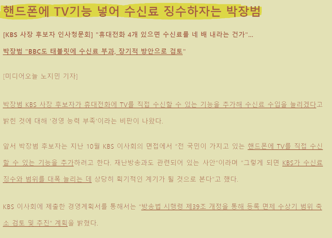 휴대전화에 TV 기능을 넣어 수신료를 징수하겠다는 KBS의 계획은 국민을 완전히 ATM기로 취급하겠다는 발상이다. 아니, 이런 황당한 생각을 대체 누가 내놓았나? 공영방송을 운영하는 데 필요한 예산을 국민의 동의 없이 강제로 빼앗겠다는 행태는 그야말로 '미친 짓'이다.