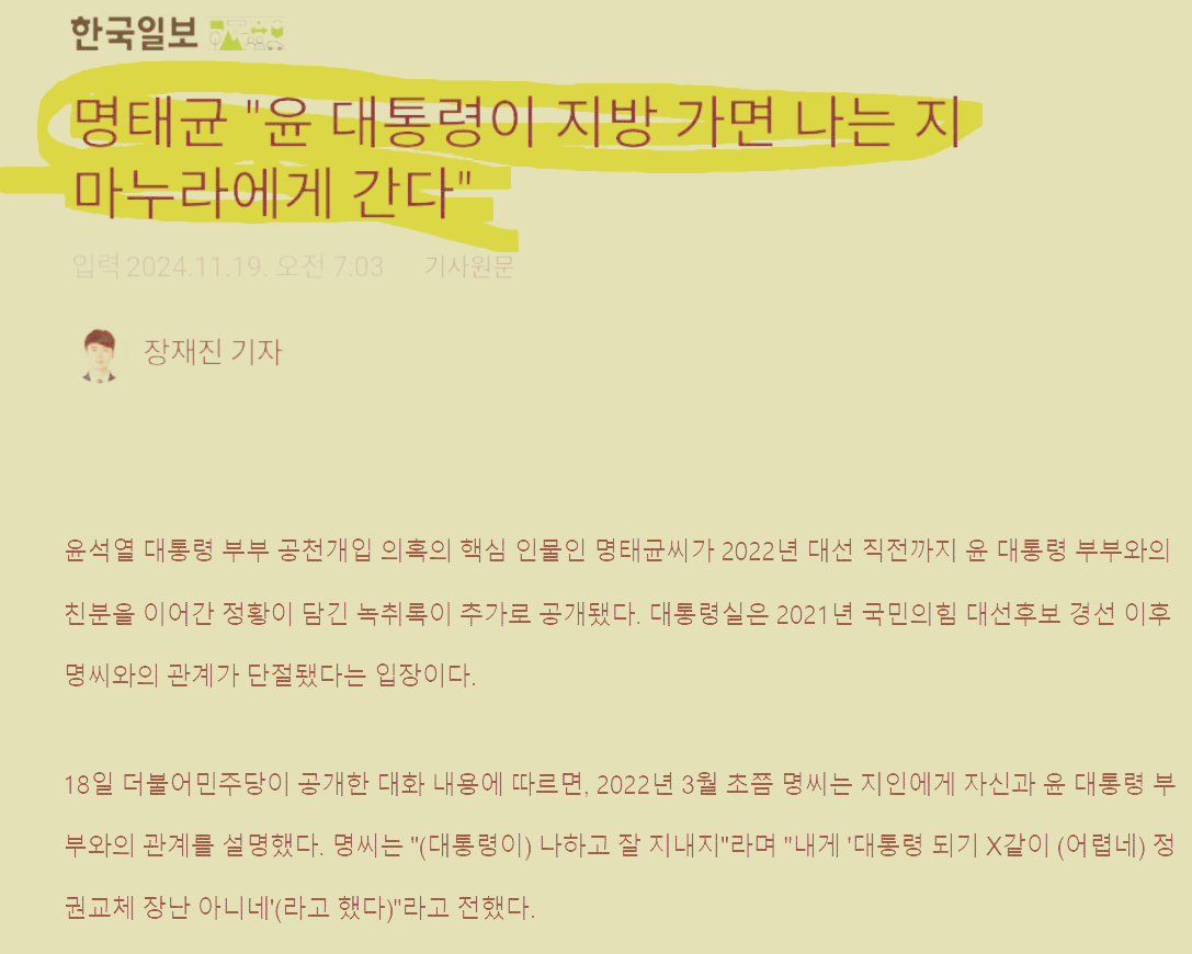 명태균과 김건희의 관계가 공적인 위치에서 이렇게 대놓고 드러나도 침묵으로 일관하는 정권, 그 자체가 이미 희극의 정점을 찍고 있다.