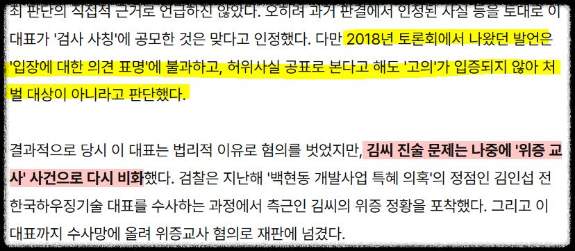 그래서 법원은 이재명의 발언을 "자신의 입장과 의견을 말한 것"으로 봤고, 허위사실 공표죄가 아니라고 판단했어.