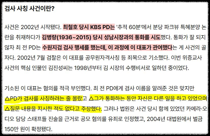 나: 위증을 시킨 검사를 파면시켜야 되는 거 아냐? 그리고 16년이 지나 이재명이 "억울하다" 고 한 건 왜 그런 거야?