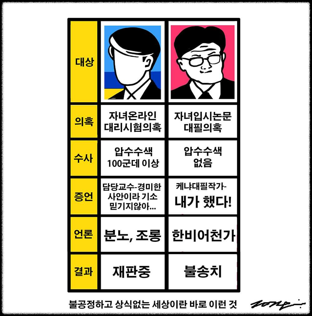 정경심 교수에게 들이댔던 법의 잣대를 이제 김건희의 비리 의혹과 한동훈 자녀의 입시 비리 의혹에 들이대라. 왜 김건희는 국민의힘 당선 후 주가조작, 도이치모터스 연루 의혹, 허위 경력 의혹에도 아무런 수사를 받지 않나? 왜 한동훈 자녀의 입시 비리 의혹에 대한 조사는 이뤄지지 않나? 검찰은 정의를 논할 자격이 없다. 이들은 국민 앞에 그럴듯한 쇼를 벌였을 뿐, 실제로는 권력자의 하수인으로 움직였다.
