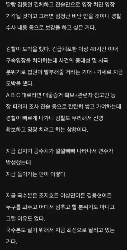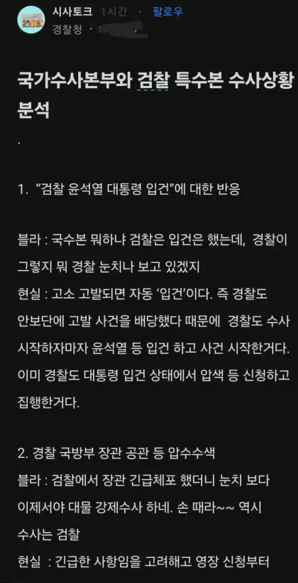 이 글은 경찰 내부자 또는 내부 정보를 잘 아는 사람이 블라인드 앱에 작성한 글로 보이며, 경찰과 검찰의 수사 과정과 속도, 그리고 공수처의 역할까지 복잡한 상황을 분석하고 있다. 주요 내용과 경찰의 속내를 정리하면 다음과 같다.
