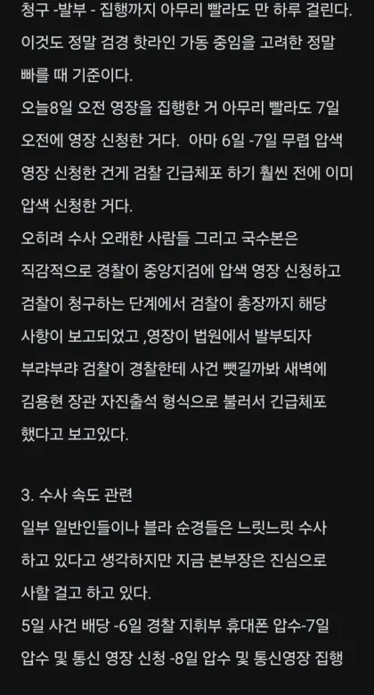 분석: 경찰은 수사 속도와 증거 탄탄함으로 대응하려 하고 있으며, 검찰의 무리한 긴급체포에 비판적인 입장을 보임. 검찰이 사건 주도권을 경찰에게 빼앗길까 우려해 서두르는 모습을 비판하고 있음.