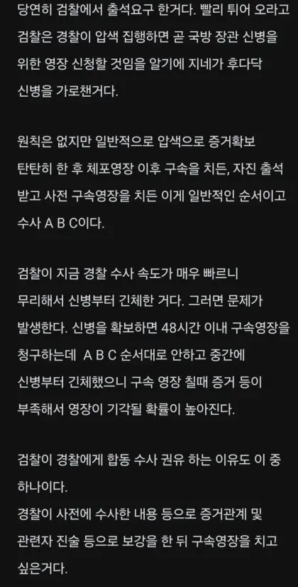 분석: 경찰은 검찰의 행동을 "ABC를 무시한 무리한 수사"로 평가하며, 구속영장이 기각될 가능성을 경고. 이는 경찰의 수사가 더 합리적이고 체계적이라는 주장을 뒷받침.