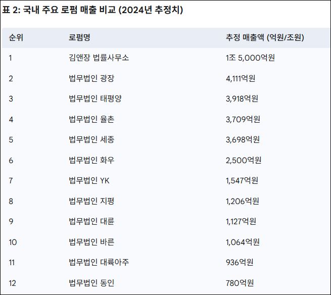 표 2: 국내 주요 로펌 매출 비교 (2024년 추정치)