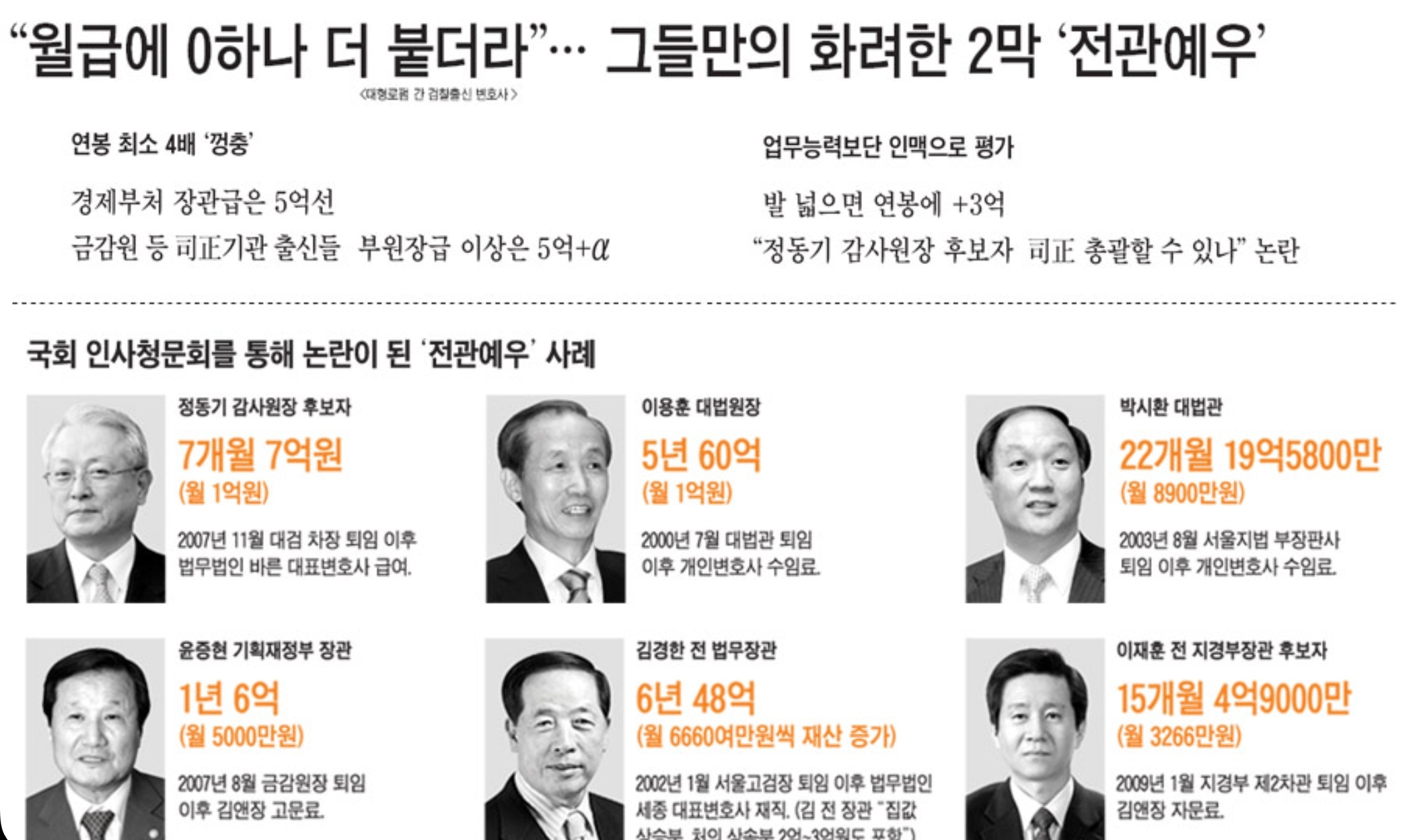 전관예우의 검은 고리: 퇴직한 판사, 검사가 로펌으로 직행하여 자신이 몸담았던 법원, 검찰의 사건을 맡는 '전관예우'는 공정성에 대한 국민의 신뢰를 갉아먹는다. "사건 배당 전부터 김앤장 소속 전관 변호사가 재판부와 교감한다"는 식의 의혹은 사법 시스템 전체에 대한 불신을 야기한다.
