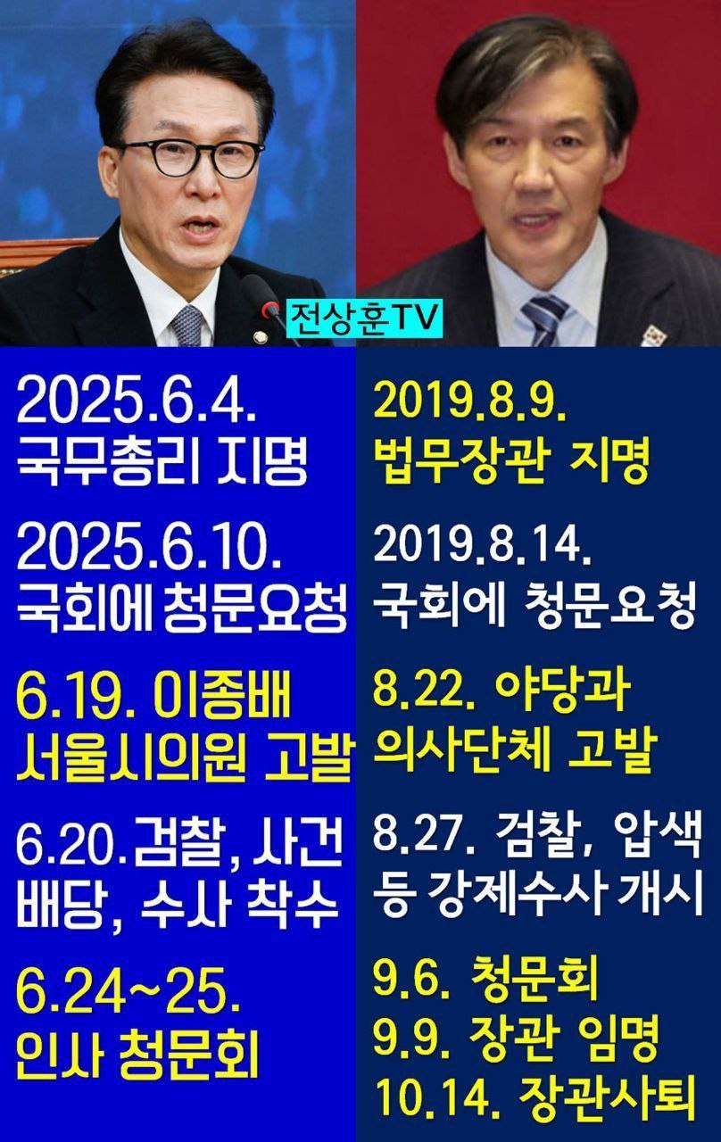 이 모습을 보며 많은 사람들이 "어? 이거 어디서 많이 봤는데?" 하는 생각을 할 거다. 맞다. 마치 5년 전, 대한민국을 떠들썩하게 했던 '조국 사태'의 재방송을 보는 듯한 느낌이다. 온라인에서는 벌써 "조국 시즌2다", "그때랑 판박이네" 하는 반응들이 쏟아지고 있다.