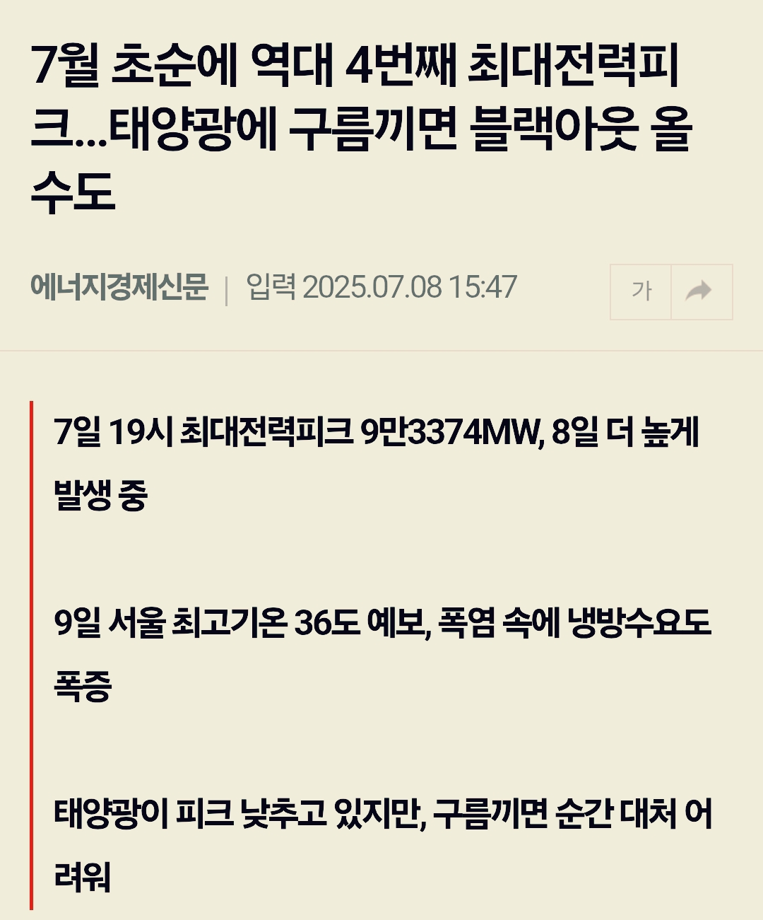 한국에서 태양광이 공격받는 방식은 매우 익숙하다. “구름이 끼면 블랙아웃이 온다”, “폭염에 쓸모없다”, “중국산 패널만 쓰인다” 같은 비과학적 왜곡 보도가 반복적으로 등장한다. 실제로 2025년 7월 초순, 일부 언론은 "남부지방에 구름이 끼면 태양광 출력이 줄어들어 전력수요가 폭증하고, 자칫 전국 정전으로 이어질 수 있다"며 공포를 조장했다. 2023년 8월 20일에도 유사한 주장이 등장했지만, 시민들은 이미 알고 있었다. 태양광은 구름이 끼면 출력이 줄어들지만, 동시에 기온이 낮아져 냉방 수요도 급감한다는 기본적 상식을 말이다.