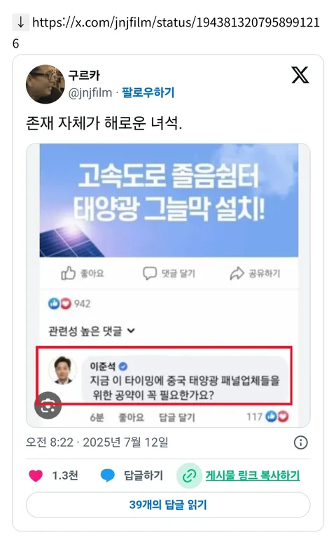 졸음쉼터에 그늘막 설치가 '중국 퍼주기'라니. 이건 단순한 무식이 아니라, 국가 에너지정책을 비하하고 태양광 산업 전체를 음모론으로 덮으려는 정치적 술수다. 태양광은 기후위기와 에너지안보를 동시에 해결할 수 있는 핵심 기술이다. 이미 전 세계는 태양광 중심으로 에너지 전환을 가속화하고 있고, 한국도 그 흐름에 발맞추려 애쓰고 있다. 그런데 이준석은 국가 기반 인프라 사업조차 ‘중국 돕기’라는 프레임으로 덮어씌우며, 대한민국의 산업경쟁력 자체를 부정하고 있는 것이다.