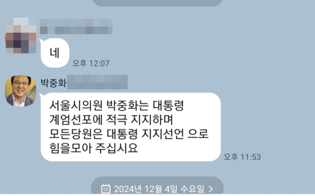 - 박중화 서울시의원: 모바일 메신저 대화방에서 "대통령 계엄선포에 적극 지지하며 모든 당원은 대통령 지지선언으로 힘을 모아 주십시오"
