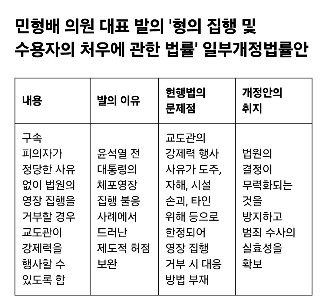 이 법안의 핵심은 구속 피의자가 정당한 사유 없이 법원의 영장 집행을 거부할 경우 교도관이 강제력을 행사할 수 있도록 하되, 현행법의 문제점을 보완하는 것이다. 특히 주목할 점은