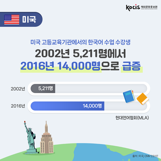 이러한 문화 소비는 자연스럽게 언어 학습 수요의 외연 확장으로 이어지고 있다. 듀오링고 2024 리포트에서 한국어는 전 세계 학습 언어 Top10(7위)을 유지했으며, 미국 대학(MLA) 집계에서는 2016-2021년 한국어 수강생이 38.3% 증가하여 주요 언어 중 유일한 고성장세를 보였다.