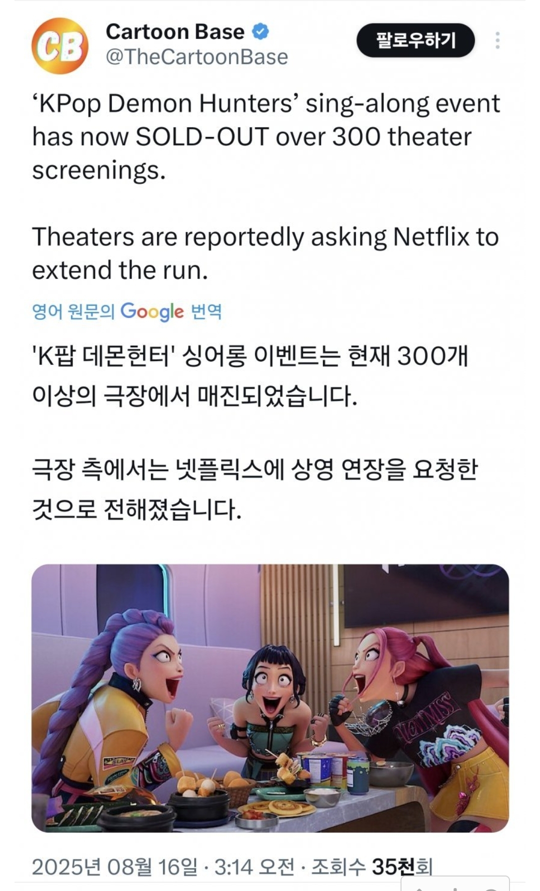 넷플릭스 애니메이션 영화 '케이팝 데몬 헌터스'(케데헌)가 북미에서 싱어롱 특별 상영을 확정한 가운데 한국에서의 진행 여부에도 관심이 쏠리고 있다. 넷플릭스 측은 한국에서의 싱어롱 상영