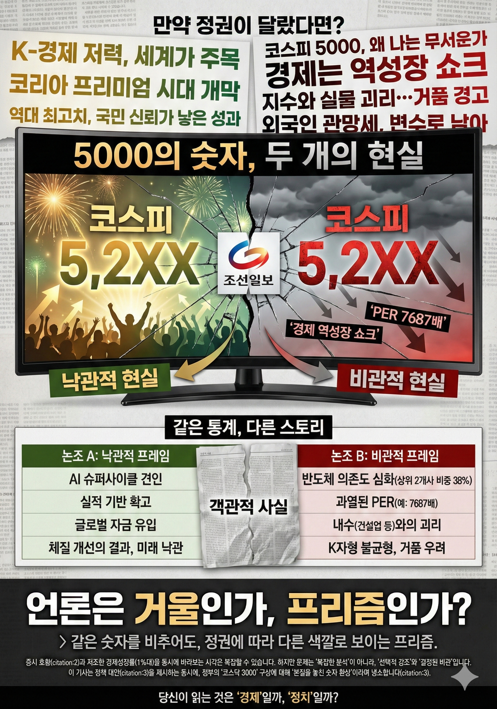 조선일보는 코스피 5000을 "지수와 실물의 괴리", "투기 심리에 의한 거품", "곧 폭락할 함정"으로 규정한다. 만약 이것이 이명박 정부나 박근혜 정부 시절이었다면? "K-경제의 저력", "세계가 인정한 한국 증시", "코리아 프리미엄 시대 개막" 같은 제목으로 1면을 장식했을 것이다.