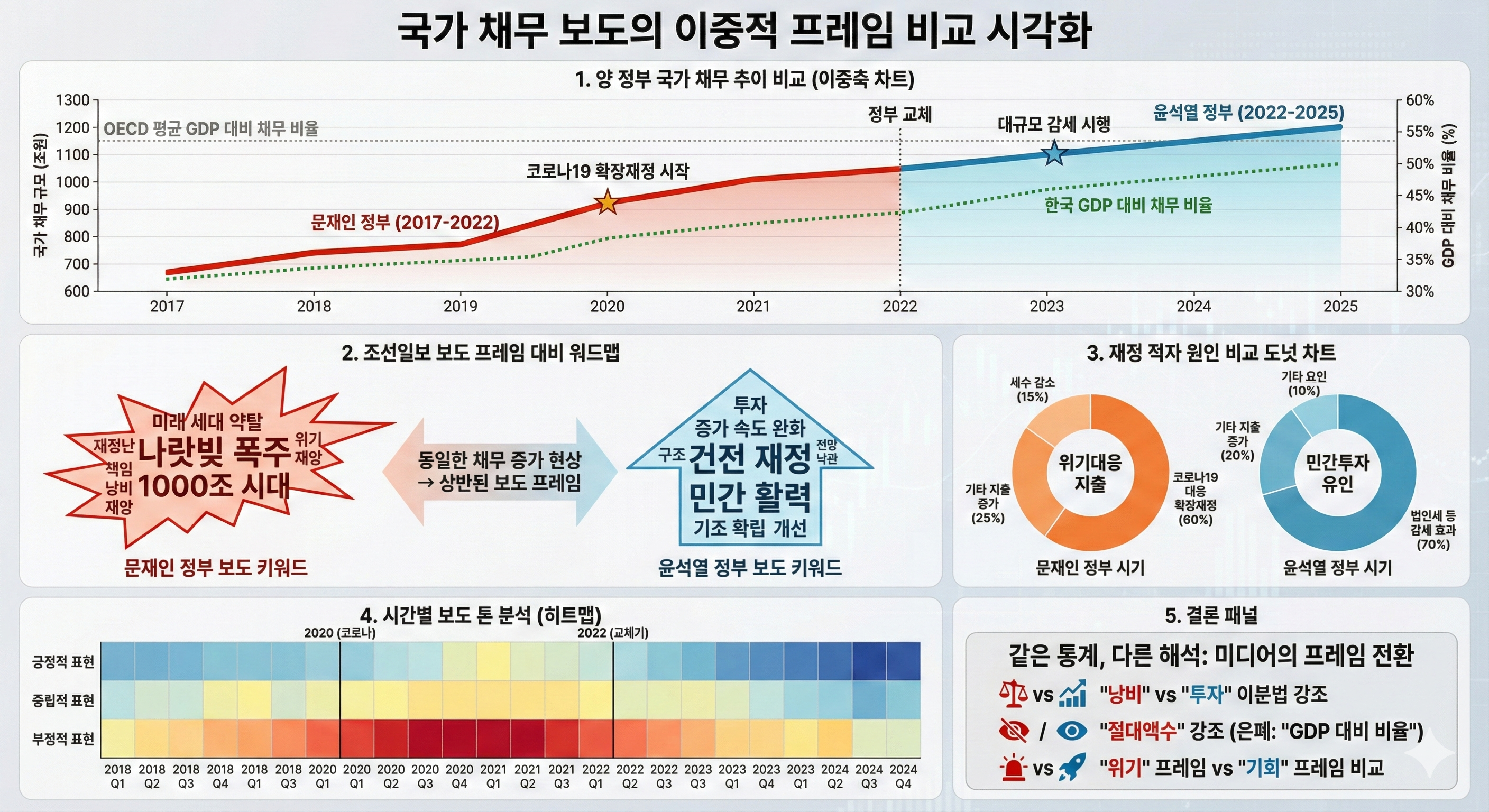 문재인 정부 시기 코로나19 대응을 위한 확장 재정으로 국가 채무가 증가하자, 조선일보는 '나랏빚 폭주', '미래 세대 약탈', '베네수엘라행 급행열차' 등의 자극적 언어로 비판했다. GDP 대비 채무 비율이 OECD 평균보다 현저히 낮다는 맥락은 소거하고, "나랏빚 1000조 시대"라며 절대 액수를 부각해 공포감을 조성했다.