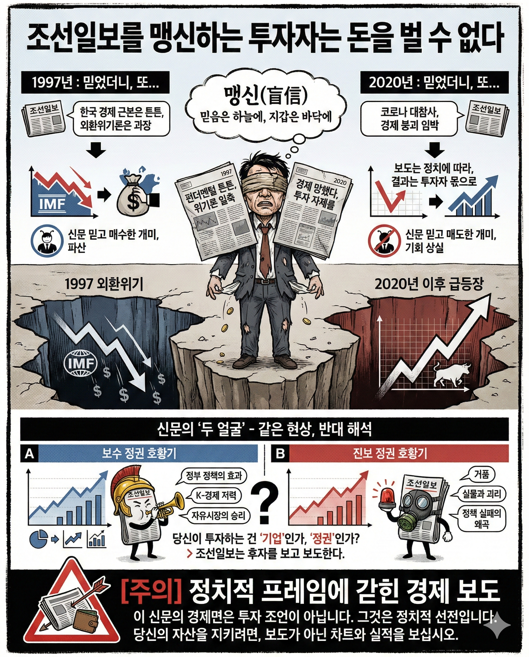 조선일보는 진보 정권 때는 긍정적인 경제 지표도 비관적으로 해석하고, 보수 정권 때는 부정적인 지표도 낙관적으로 포장한다. 그 결과 조선일보의 경제 기사를 맹신하는 투자자들은 절대로 돈을 벌 수 없다는 것이 나의 확신이다. 지난 30년간의 데이터가 이를 증명한다.