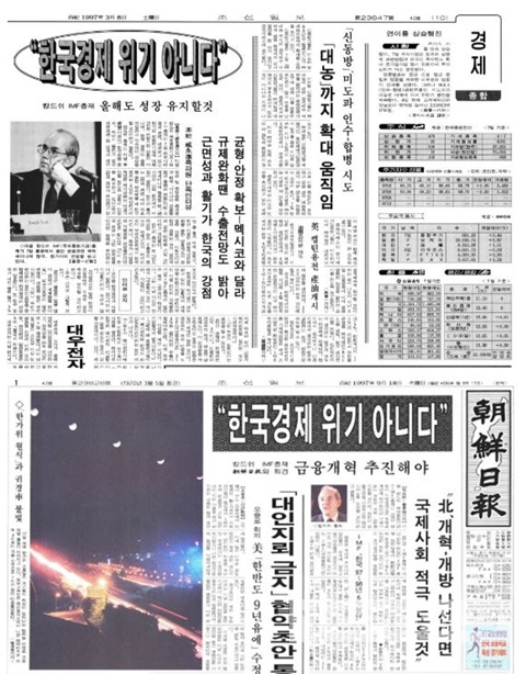 1997년 IMF 외환위기 당시 집권당은 김영삼 정부였다. 위기 직전 환율이 폭등하고 외환보유고가 바닥을 드러냈을 때, 조선일보는 정부의 "펀더멘털은 튼튼하다"는 입장을 충실히 전달했다. 위기설은 '유언비어'로 치부되거나 야당의 정치 공세로 폄하되었다.